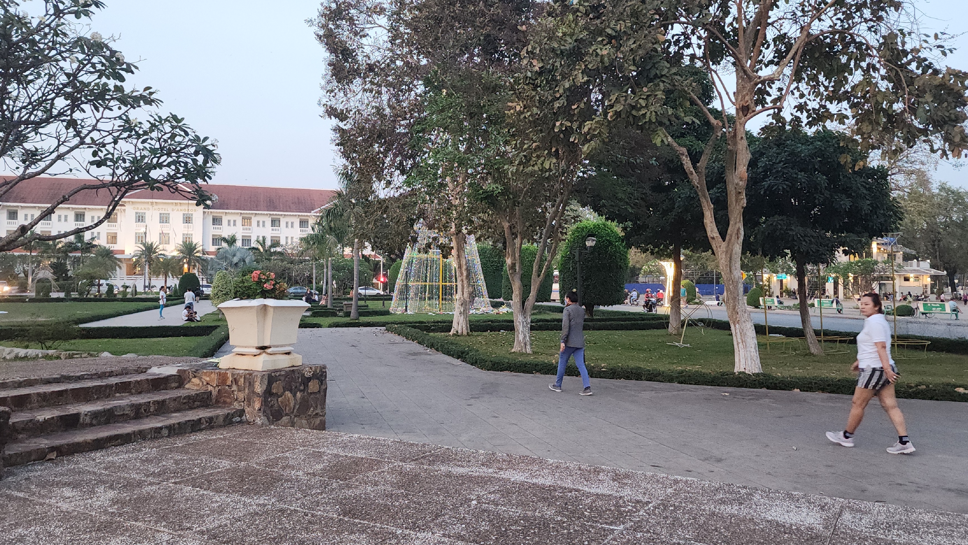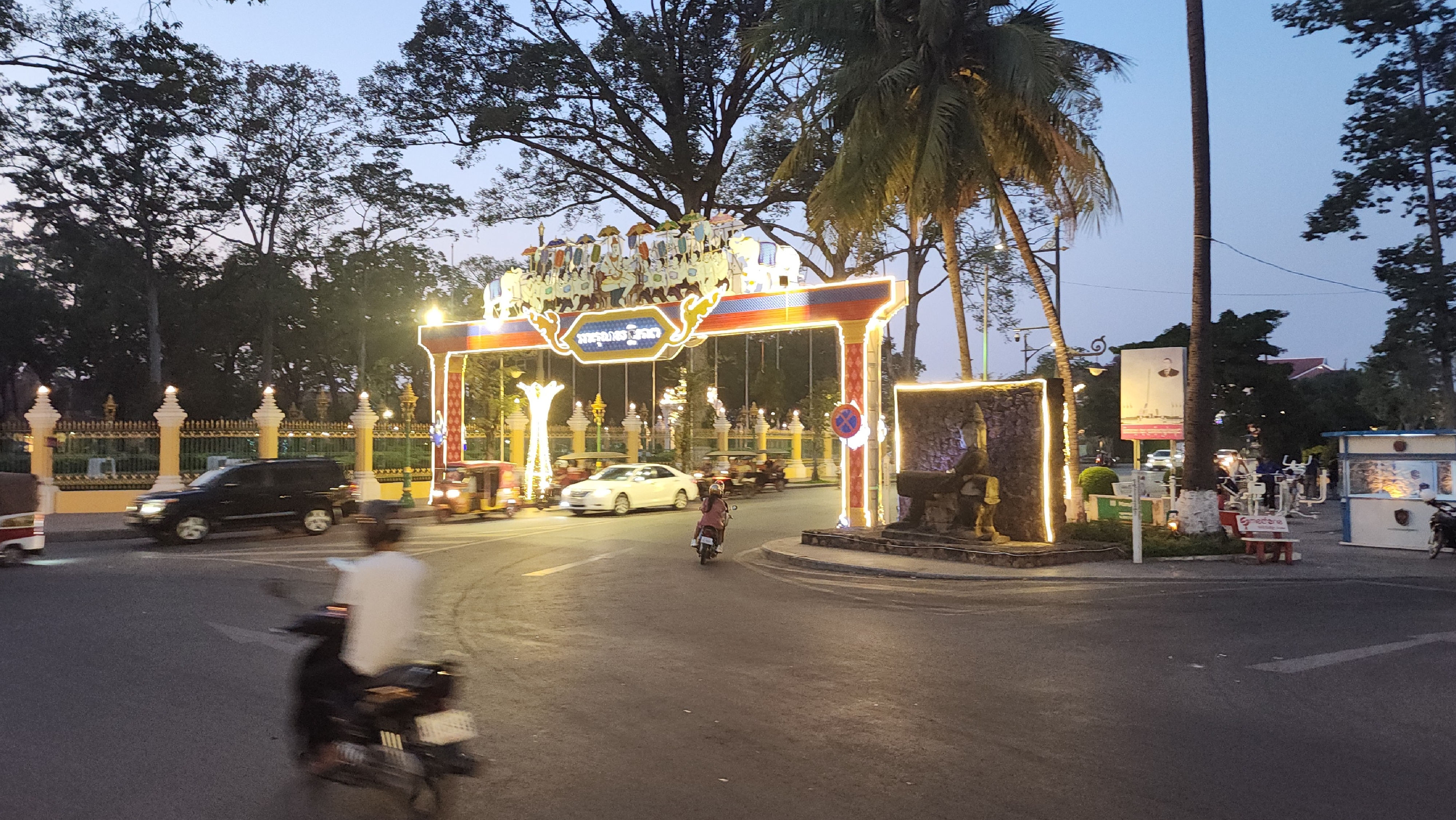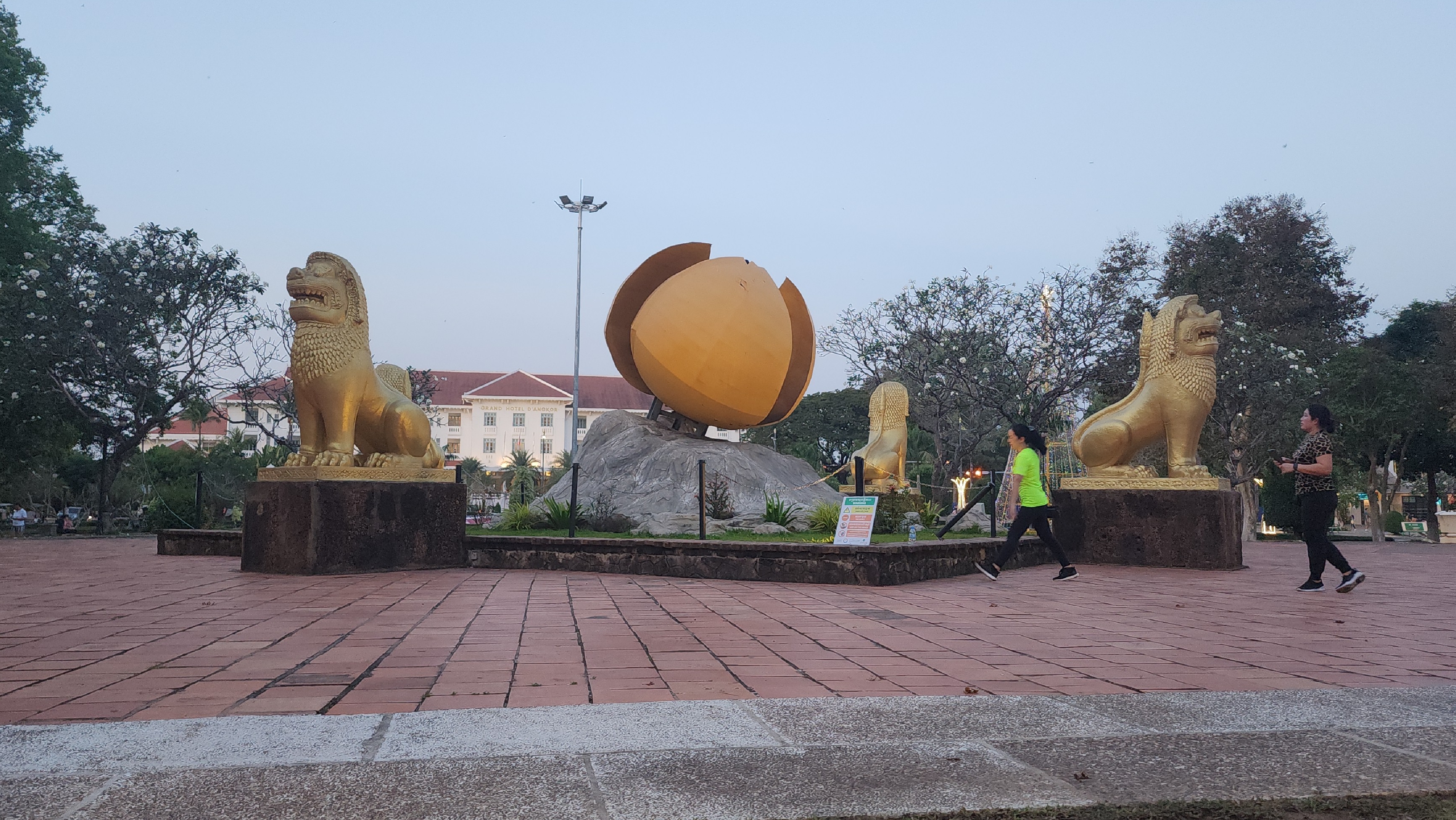 박쥐 공원 중앙에는 조형물이 서 있고, 세 마리의 사자상(캄보디아 상상의 수호동물 싱하) 중앙에 있는 꽃은 롬두올 꽃이다.